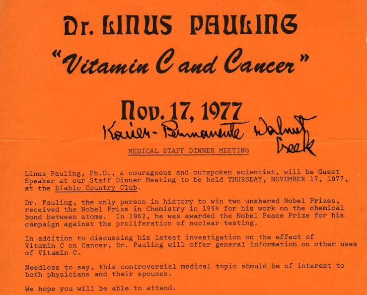 Pauling és egy Ewan Cameron nevű orvos 1976-ban számoltak be az intravénás C-vitaminnal kapcsolatos eredményeikről. Száz végstádiumú rákbetegeknél alkalmazták a terápiát, akiknél ez a kezelés az ő értelmezésük szerint megháromszorozta túlélést, összehasonlítva az úgynevezett histórikus kontrollokkal. A histórikus kontroll azt jelenti, hogy utólag választották ki azokat a betegeket, akikkel összehasonlították a C-vitaminos csoportot, ami igencsak megkérdőjelezhetővé tette a vizsgálatot.